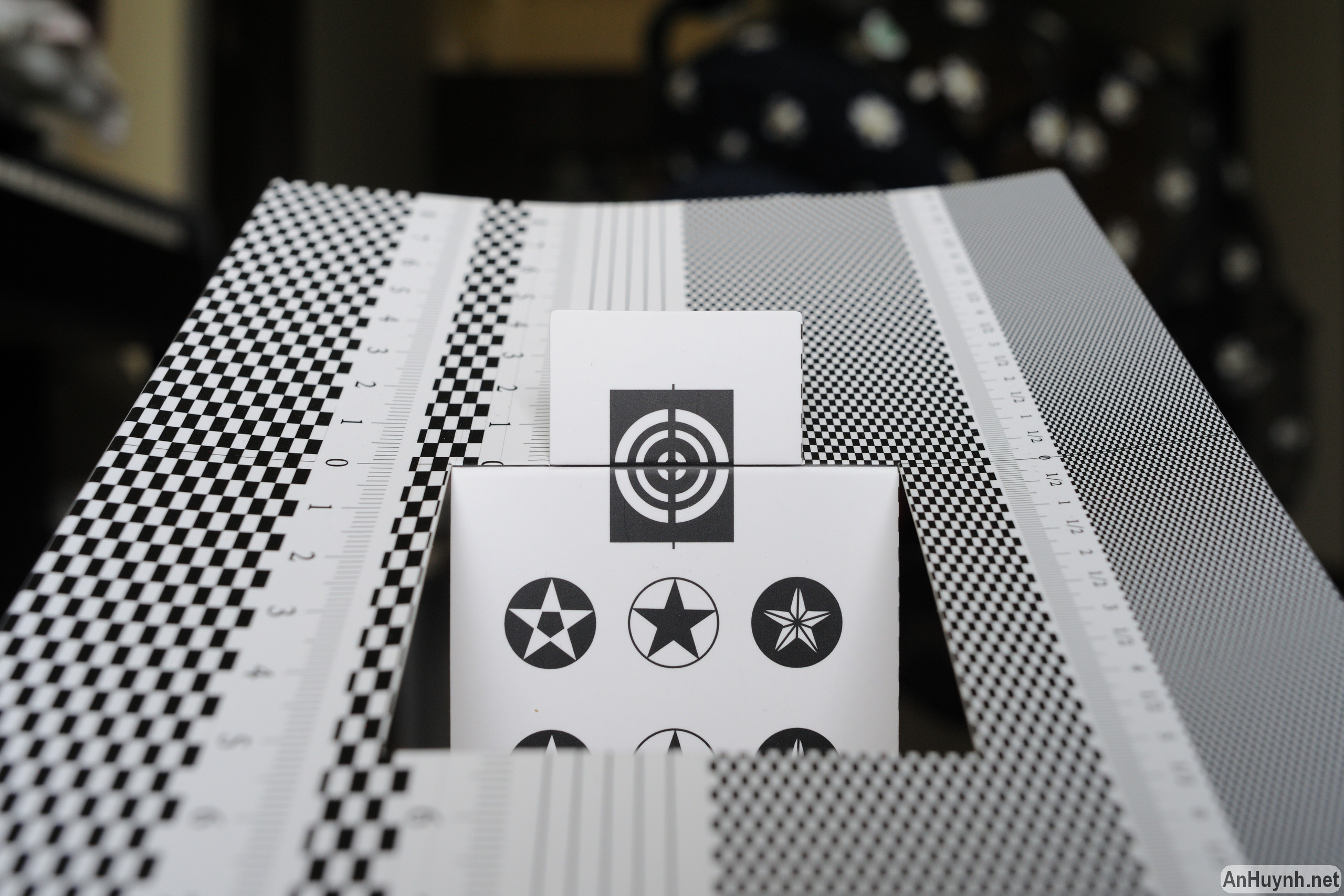 Tiếp theo là loạt các hình chụp sơ đồ với khoảng cách lấy nét khoảng 0.6 m. Ở f/2, hình ảnh rất nhòe, độ sắc nét rất kém, quang sai cầu (spherical aberration) khá nặng, và có một chút quang sai sắc (chromatic aberration). Khép khẩu dần dần thì các hiện tượng này giảm đi nhiều. Mình thấy so với khi dùng Speed Booster, hiện tượng quang sai sắc (viền tím) lần này là rất ít, khép xuống f/2.8 thì thấy gần như đã hết. Về độ sắc nét, mình không chắc có phải do mình lấy nét chưa chuẩn, nhưng các tấm hình này khi đặt cạnh đợt trước thì độ sắc nét kém hơn hẳn, nhất là ở phần trung tâm. Có vẻ như khi dùng Speed Booster, độ sắc nét phần trung tâm tấm hình được cải thiện nhiều. Nhưng mặt khác, khi dùng Speed Booster, trừ phần trung tâm, các phần còn lại của hình thì hiện tượng quang sai sắc lại trầm trọng hơn hẳn.